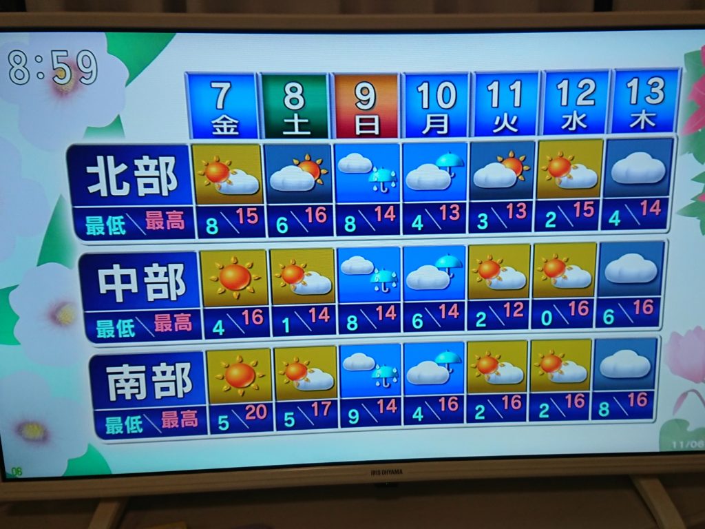 金曜夜は弱冬型、翌日大陸からの高気圧に覆われた。1030hPa、まさに秋の空高くなる予報