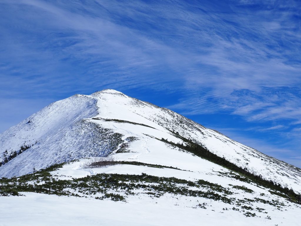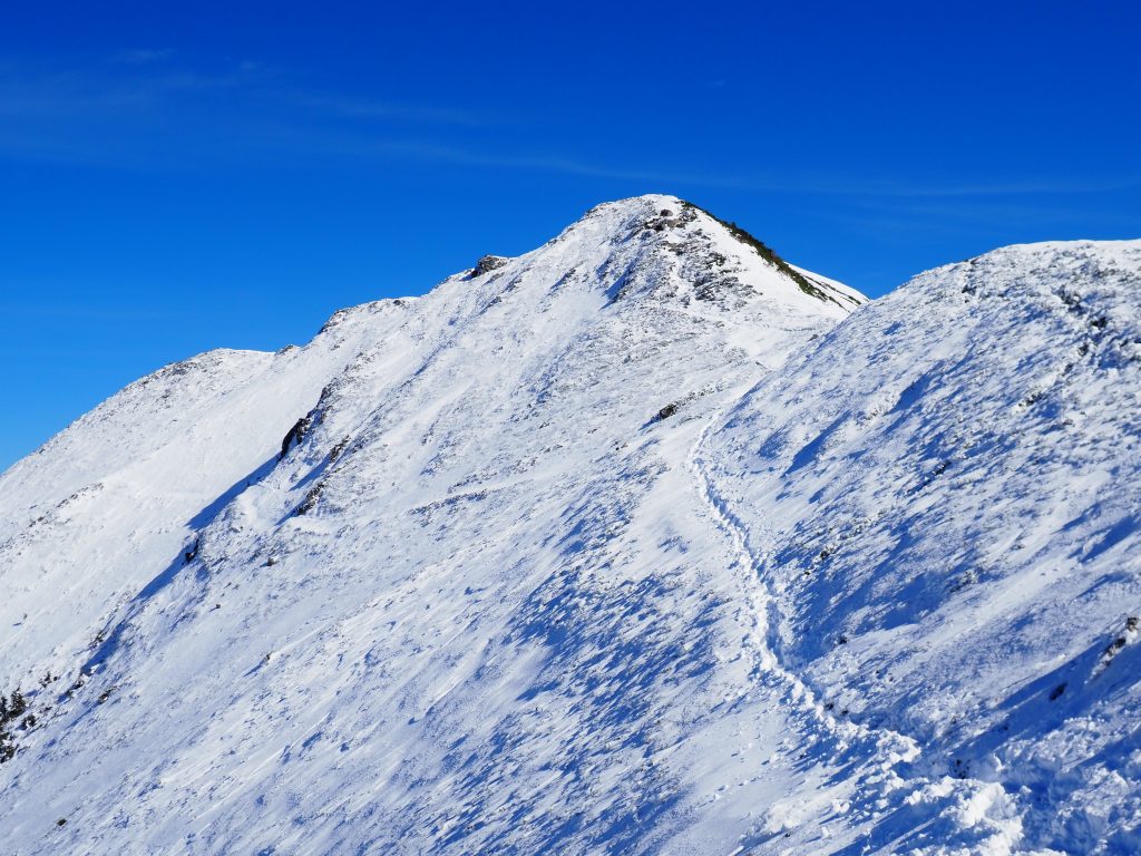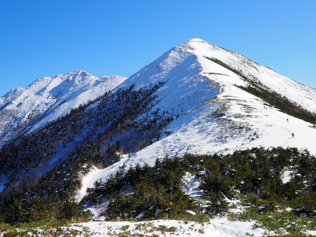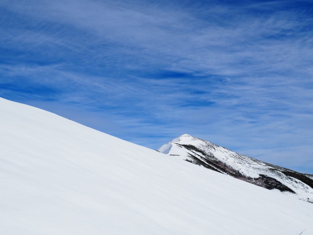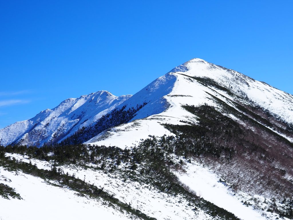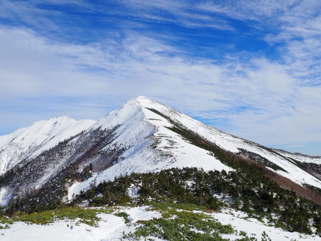 爺ヶ岳もしっかり雪。やはり雪が乗ると山容が立派にみえます。風で雪が飛ばされることもなく、山頂まで雪道でアイゼンを履いたまま登れた。