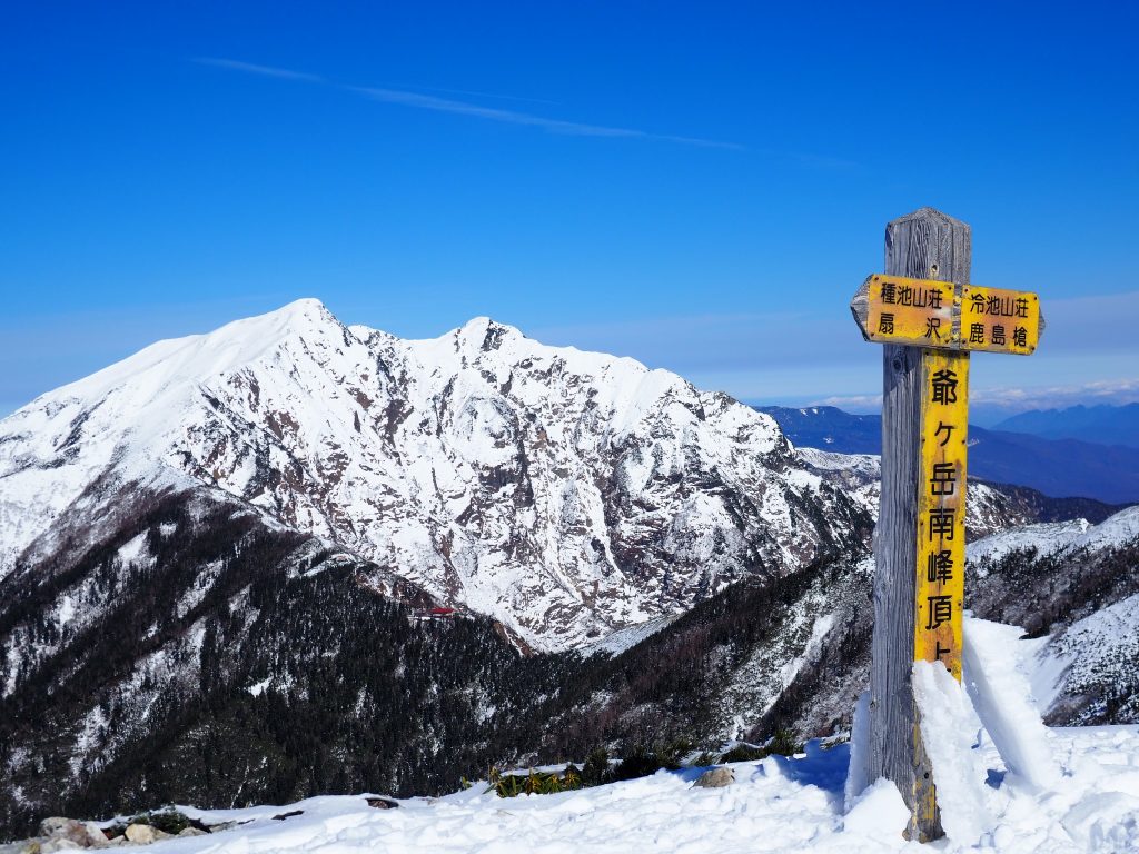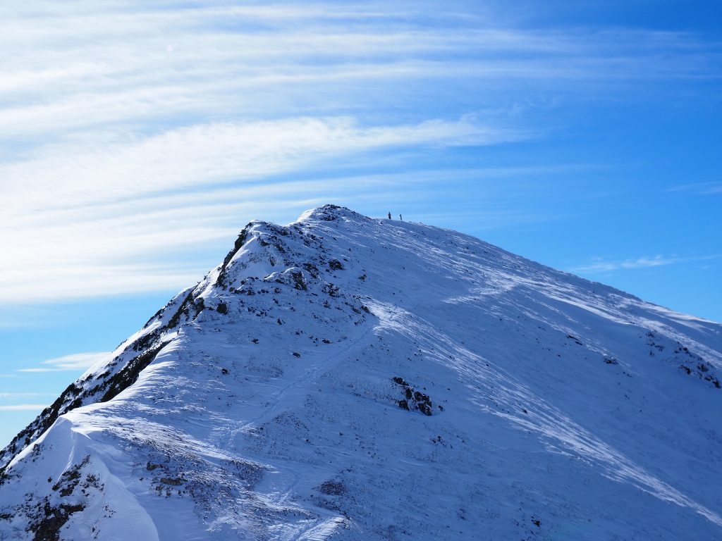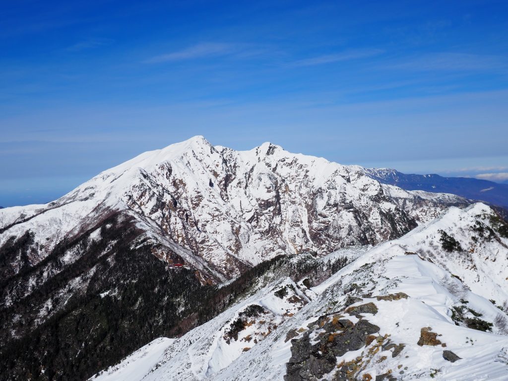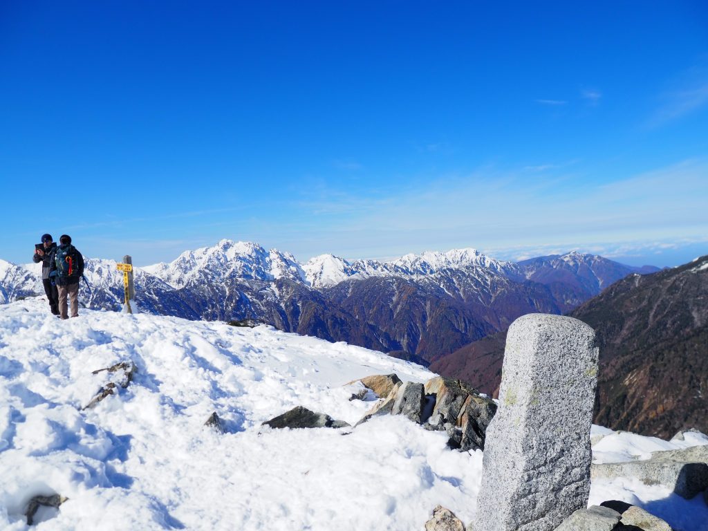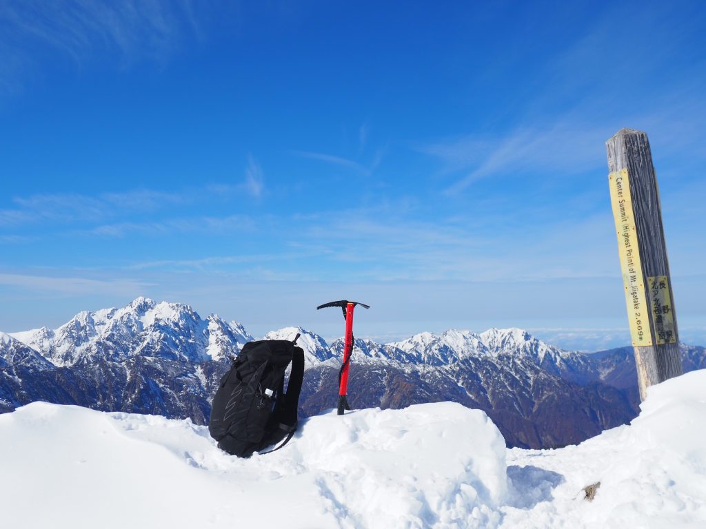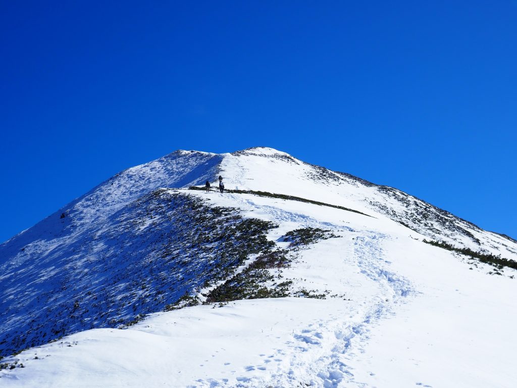 爺ヶ岳もしっかり雪。やはり雪が乗ると山容が立派にみえます。風で雪が飛ばされることもなく、山頂まで雪道でアイゼンを履いたまま登れた。
