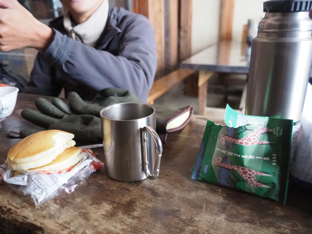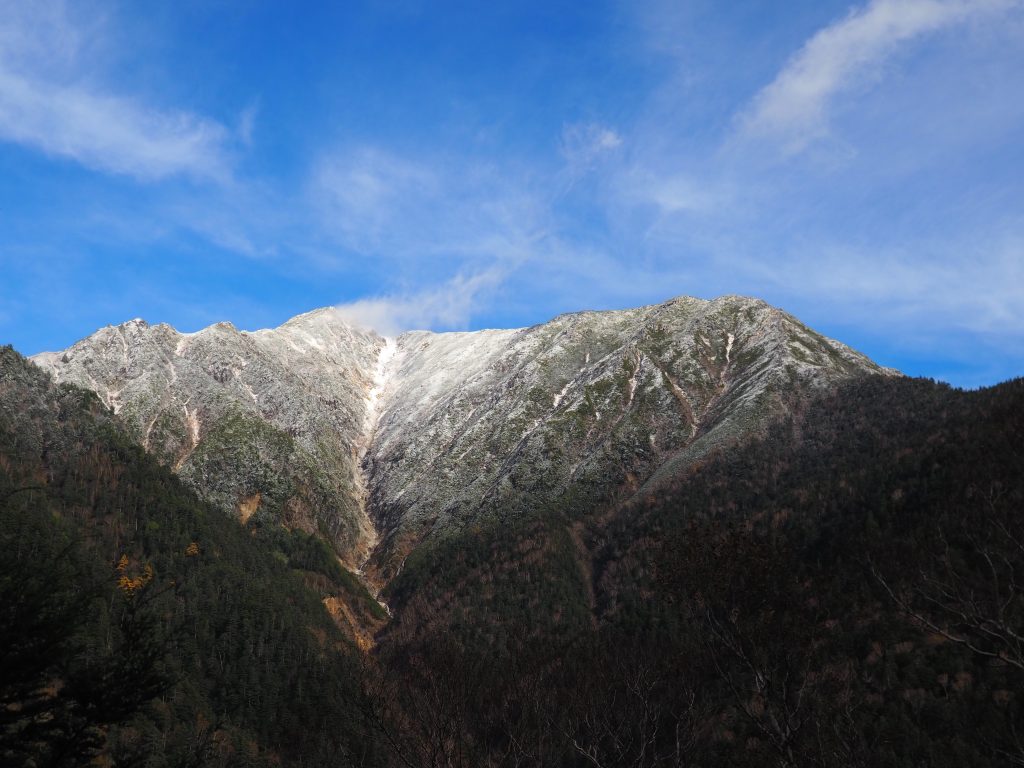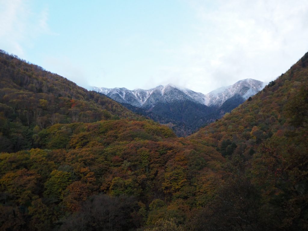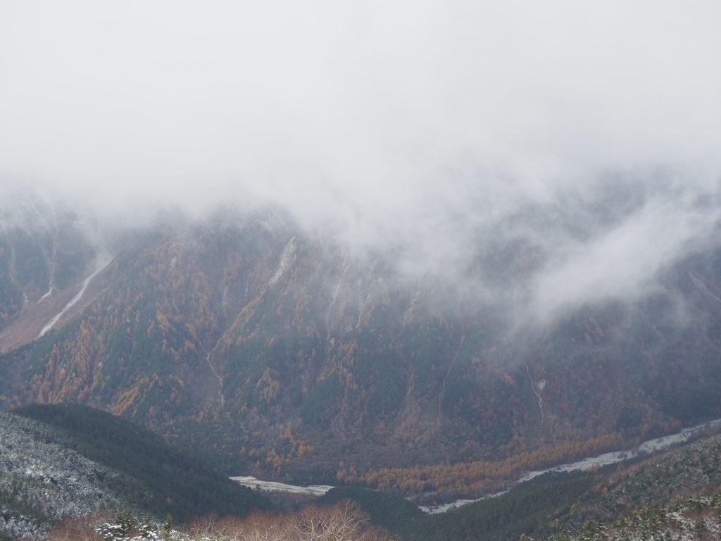 4時半起床、5時すぎ発、新島々のセブンでコーヒー、6時すぎ三股。第一駐車場はいっぱいだったので、下った第二駐車場に停める。稜線は冠雪しているようだった。このあたりの紅葉が美しかった。