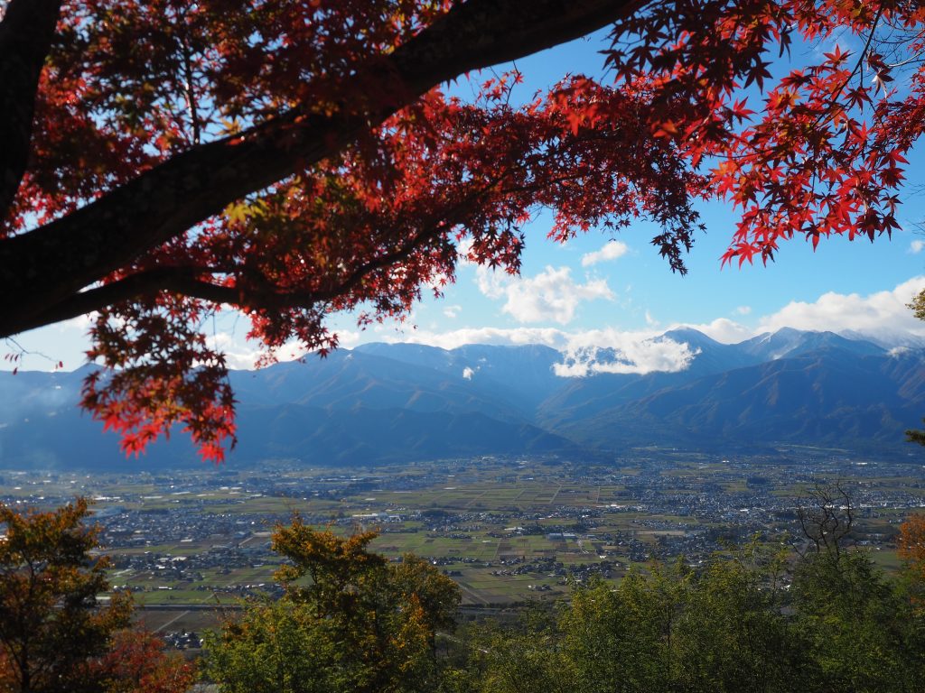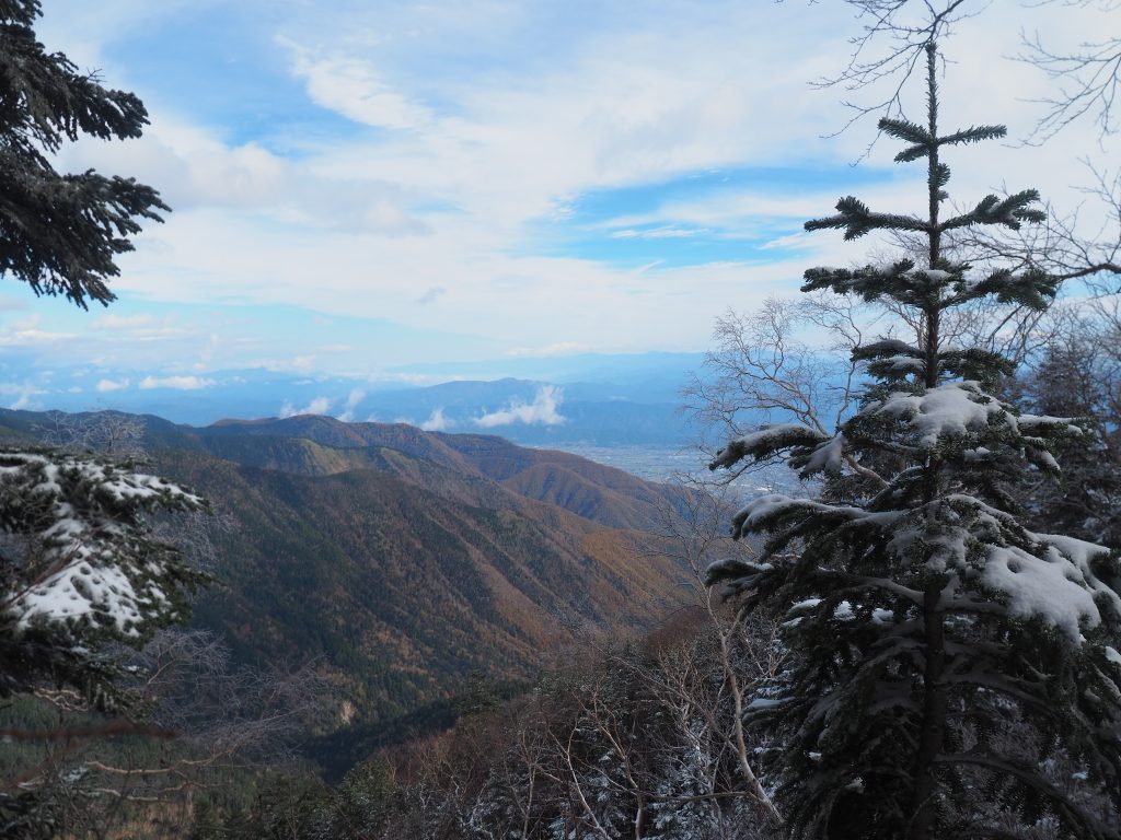9時間眠る、お酒をたくさん飲んだ後は、眠りが浅い気がする。カリフォルニアドリーミング流しながら、寒空の下、一日市場のフォレスター回収。仕事の入った賢二と別れて、ひとり豊科のコメダで食事。雲も若干退いてきたので、光城山に上がって見晴らしのきくところから写してみる。山は逆光気味で白くうつらなかったが、植えられていた木々の紅葉がきれいだった。
